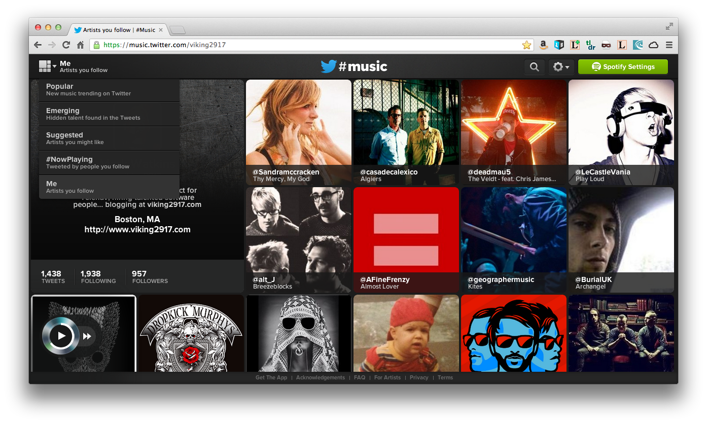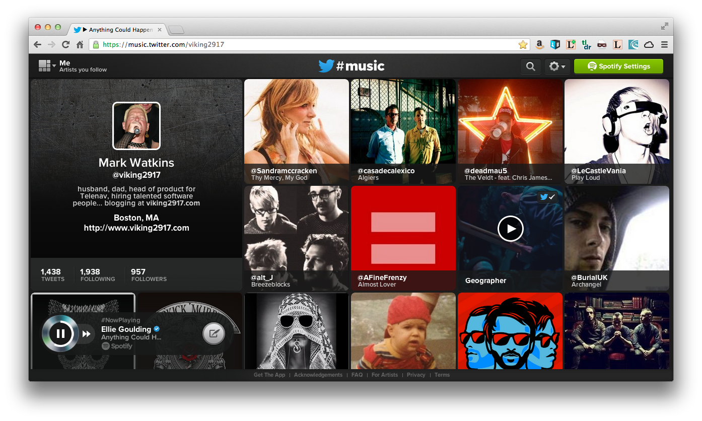 Twitter recently launched a social music discovery site, music.twitter.com. It’s pretty interesting. There have been a variety of music discovery music sites launched recently, including sites like Spotify, Shuffler.fm, ex.fm, Turntable.fm, and a host of others. Only a few of them have an explicit social angle. Spotify and Turntable are probably the most social of the lot. I’ve long since abandoned Turntable like everybody else (talk about yesterday’s darling!), whereas Spotify is one of my primary music consumption environments – although, the social piece isn’t really why I use it.
