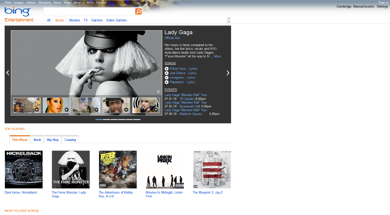 Bing Entertainment (http://www.bing.com/entertainment) covers Music, Movies, TV, Games, and Video Games. It has a very attractive, browsable interface with a lot of rich media – for example, the music page shows photos, links to audio clips of the artist, as well as upcoming live performances. In spirit, I love what they are trying to do. They’ve even stolen a page from the wonderful (but defunct) service Lala which Apple acquired. You can play over 5 million songs in their entirety once for free. So if you ever wondered if you’d like Miles Davis’ Flamenco Sketches, now you can find out, for free, without engaging in any piracy: http://www.bing.com/music/songs/search?q=miles+davis&go=&form=DTPMUS.