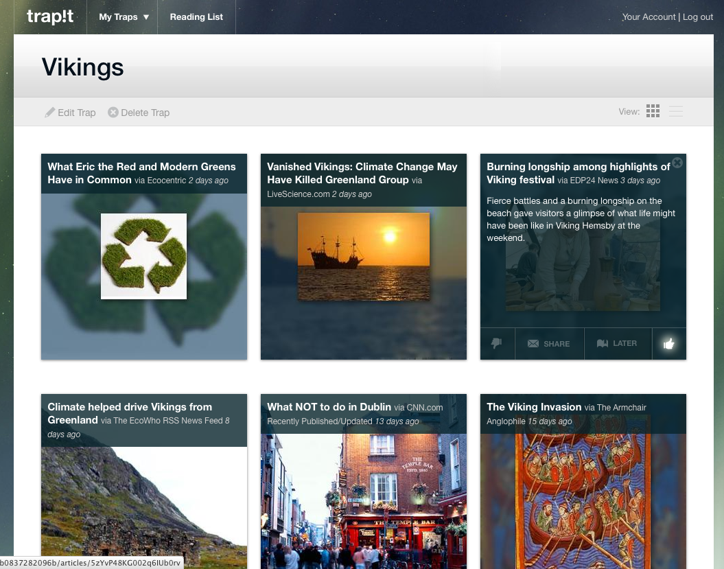 I gave it a few tricky concepts to warm up on. My first test was to get a stream of content about Vikings (the Scandinavian kind, not the football team) – no surprise, given the title of this blog. Since there are two very well defined concepts there, it’s a chance to see how well the learning engine can hone in on the concept, and not the word itself. I got a quick stream of viking stuff, half of which was about the Scandinavians and half the football team. I thumbed down about 4 articles on the Minnesota Vikings, and presto, my stream has become empty of football. Pretty impressive! The main problem now is the stream is mostly full of one news story, about climate change impacting Greenland, with many different sources recapping the same article. So while the concept disambiguation is working, they need a “story disambiguation” similar to what Google News has. I also found it awkward to get more results into the trap – there is an “infinite scroll” option, where as you scroll you get more articles, but my Viking trap could never get more than about 16 or so articles. Not sure whether this is a UI limitation, or whether their base of indexed documents simply doesn’t have more. They also need some way to delete an article from the feed, or mark it as read – the UI suggests that this is a kind of very smart RSS reader, but the basic mechanics of RSS readers are missing….once I’ve read something, I want to get it out of the way.